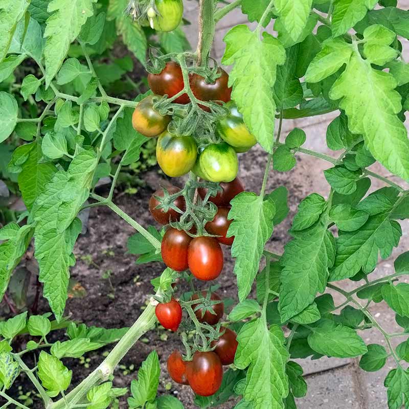 Velsmagende mørkerød-sort blommetomat. Gammel russisk sort. Tomaterne er æggestore.